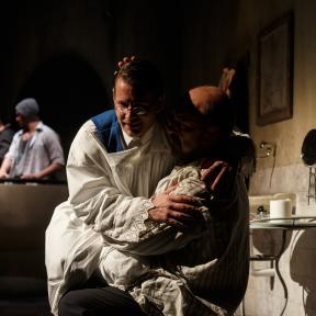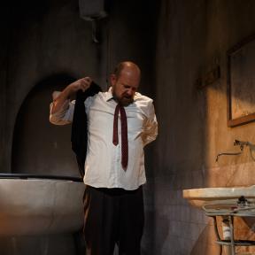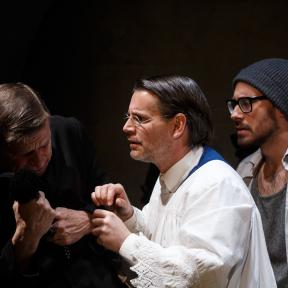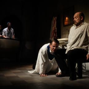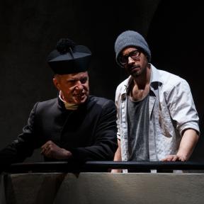 /… Odlična igra nastopajočih nas povsem prevzame in prepriča: v vlogi očeta nastopi Peter Musevski, njegov sin je Miha Rodman, preostala dva prišleka, ki nepričakovano splezata iz straniščne školjke, pa sta Borut Veselko kot duhovnik Don Carlo in Aljoša Ternovšek kot njegov cerkovnik. /