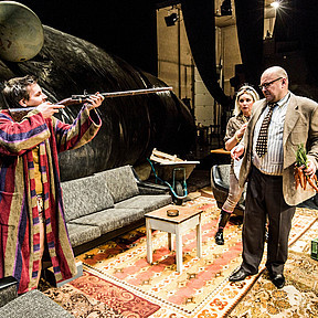 Medtem ko Joe Orton, eden od nenavadne četverice v Komediji o koncu sveta, ki o sebi trdi, da je reinkarnirani angleški dramatik, piše farso Zakaj so propadle vse kurčeve vrednote , se uprizoritev poda v prikaz načinov, kako se znajti po tem, ko so propadle vse »kurčeve vrednote «, ali natančneje – v situaciji, ko so vrednote le uporabno in spremenljivo sredstvo za utemeljitev in afirmacijo tistega , kar v določenem trenutku potrebujemo. Z Grumovo nagrado 2013 ovenčano besedilo propada ne vnaša le na moralni ravni , temveč tudi na čisto konkretni, saj je zaradi številnih ekoloških katastrof konec sveta zelo verjetno prav blizu. V takšnem nedoločljivem času z negotovo prihodnostjo in v prav tako nedoločljivem prostoru – stari propadajoči hiši brez sosedov, kot da na robu civilizacije – se znajdejo malce čudaški liki , o katerih ne vemo prav gotovo , ali so le pretirano ekscentrični , nori in nepotešeni odpadniki ali pa je svet , v katerem živijo , res že tik pred apokaliptičnim znanstvenofantastičnim vrhuncem. A čeprav takšno dvoumnost poudarja vizualna podoba uprizoritve (scenografija je delo kolektiva Numen , kostumograf je Alan Hranitelj) , je poudarek zgodbe trdno zasidran v naš poznani svet tu in zdaj. Ne gre spregledati slikovite ironične metafore , ki naj bi – kot to skozi spretno polzečo in dvoumno konverzacijsko dramo z osebami nestabilnih in izmuzljivih identitet izpiše Flisar – šele med vrsticami in za smehom predstavila temačnejšo sliko realnosti pa tudi različne načine soočanja s to. V uprizoritvi režiserja Janeza Burgerja vodi k drugačnemu učinku popolna razvidnost vsega dvoumnega in ambivalentnega, tega , kar osebe prikrivajo, razgrinjanje podteksta, torej vsebine , do katere napotuje prav zamolk v intrigantni preobleki skorajda absurdne površine farse. A vse to že poznamo. Pred nami se razgrnejo v konkretnih dejanjih izpričani nazori , ki jih poosebljajo posamezne osebe: lastnica hiše , že mimo svojih najboljših let , gospodinjsko-seksualno prilagodljiva glede na potrebe preživetja, a predvsem hlepeča po ljubezni (Vesna Jevnikar), mladi faliranec , sanjač o dramski karieri , v realnosti pa nesamozavesten iskalec lažjih poti in omame ( Aljoša Ternovšek ), novi podnajemnik, pol norec in pol znanstvenik, ki v obsedenosti z ekološko katastrofo zapuščen vrt spremeni v rajski otoček zelenjave kot edino možnost preskrbe in varnosti v razpadlem svetu (Peter Musevski) in kasneje še sumljivi prišlek, ki se izdaja za javnega uslužbenca, a se izkaže le za prevaranta in zaslužkarja, vseeno, ali kot menedžer za trženje zelenjavnega koncepta samooskrbe ali kar z donosnejšimi , čeprav prepovedanimi sadikami (Borut Veselko). Igre manipulacije in spreobračajoče se moči med njimi so očitne, a zaradi eksplicitnosti plasti za površjem tudi manj zagonetno vprašljive. Namesto vabila k detektivskemu poigravanju s premenami v odnosih je gledalec nagovorjen neposredno; prostor avditorija je nakazan kot prostor vrta, edinega možnega upanja za prihodnost sveta. Očiten prenos odgovornosti za odločitve na gledalce obarva odrsko dogajanje v nekoliko poučen prikaz (ne)možnosti in ga tudi s scensko podobo odmika v zgodbo iz nekega drugega časa in prostora. Filmsko čudaški Konjevič Boruta Veselka začetno odrsko upočasnjenost dobrodošlo razigra, a s prihodom le še poveča distanco med tem in onim svetom in tako se tudi hiter končni obračun iz ostre farse spremeni predvsem v zabavljaško prigodo.